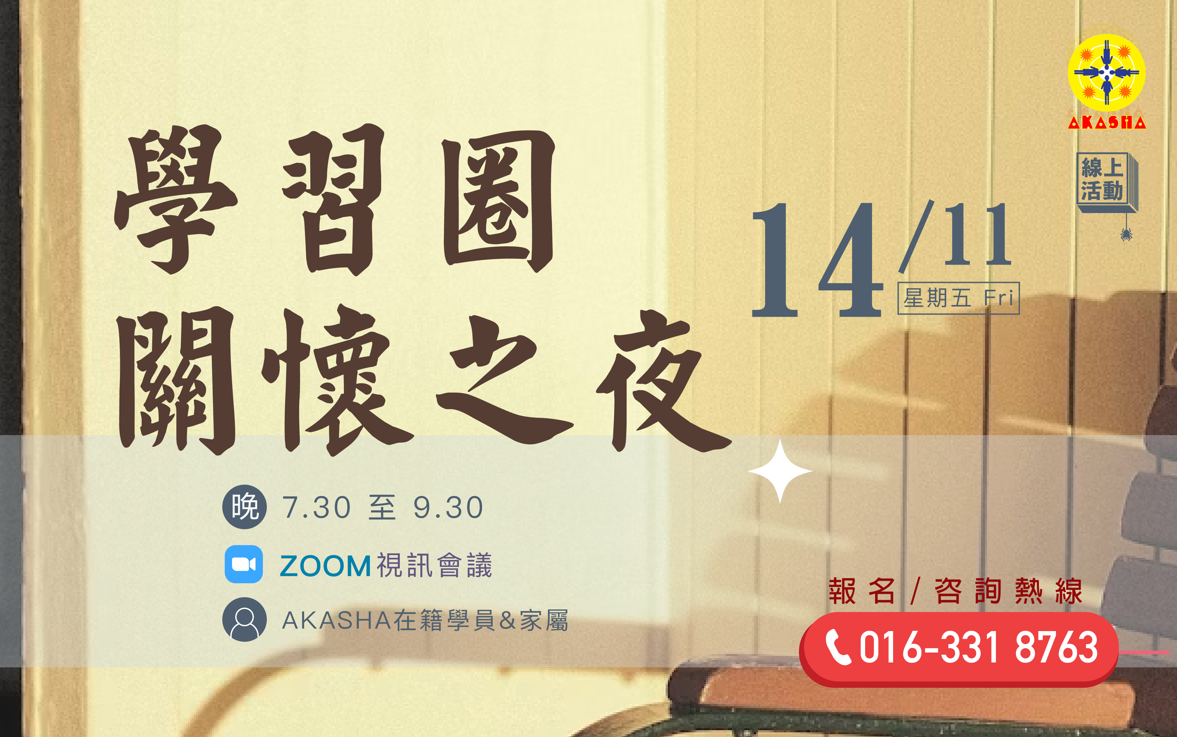 【8 月 1 日訊】歡迎學習圈在學學友及家屬報名參與每月一次的關懷之夜,按時將在第二個星期五晚上 7 點半,2025 年 8 月份活動落在 8 月 8 日,活動全程採用 ZOOM 線上會議軟體。學習圈是 AKASHA 特有的學習共同體,關懷之夜提供一個平台讓全國各地區的生命學習圈學友獲得一個線上與其他學友的交流機會。這是一個美好的相聚,你可以從短講中獲得適用的成長資訊,更可以在小組分享中更靠近新結交的朋友。歡迎學友們報名出席。