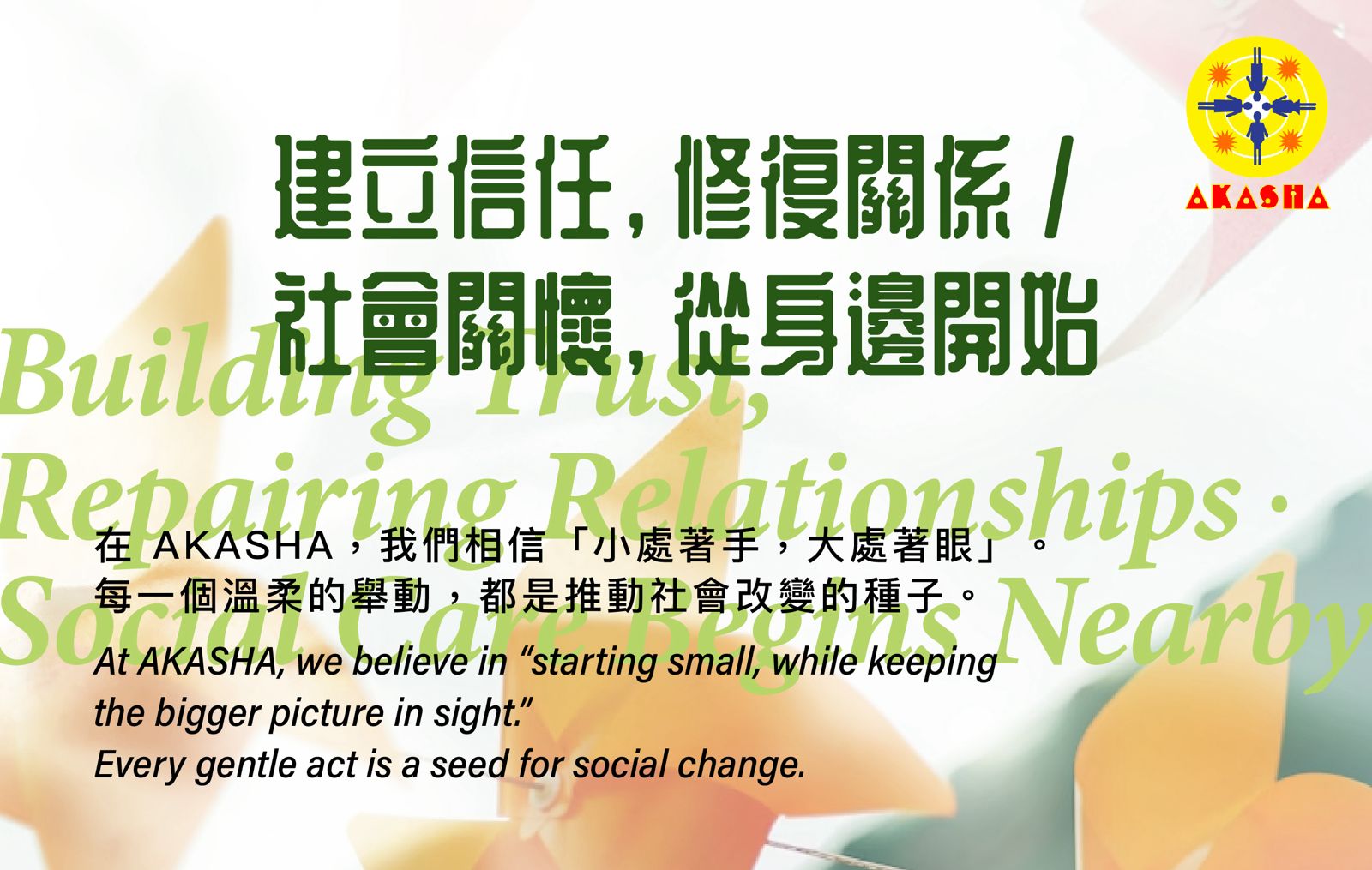 在 AKASHA,我們相信「小處著手,大處著眼」。每一個溫柔的舉動,都是推動社會改變的種子。然而,在講求效率與成就的社會裡,人們往往相信「成大事者不拘小節」。但我們相信,社會的良善必須從細微處培養起來。